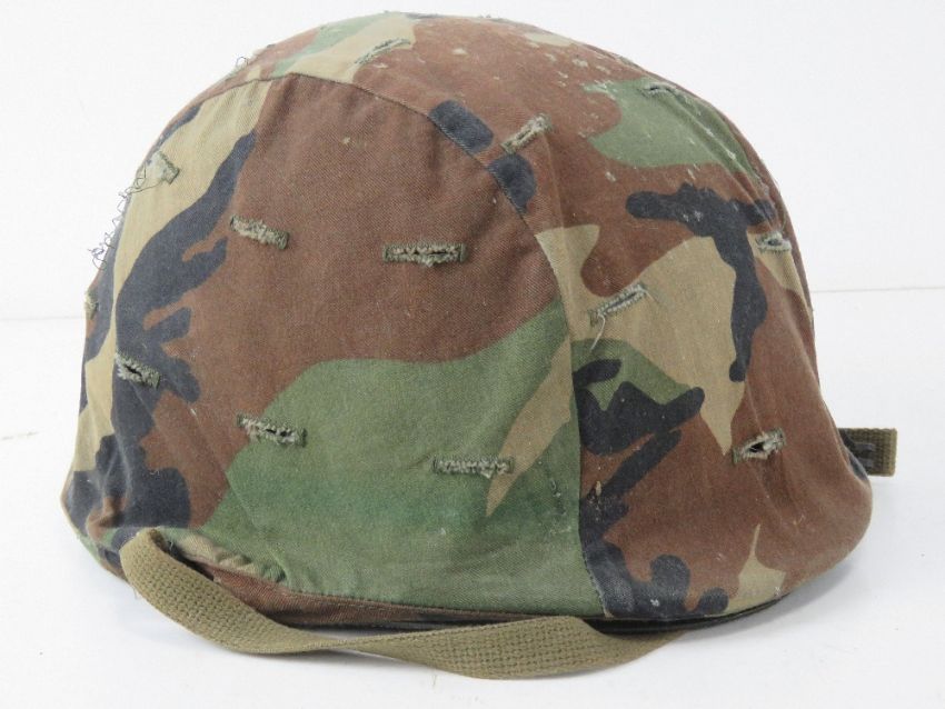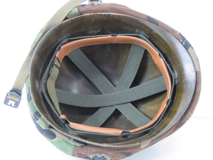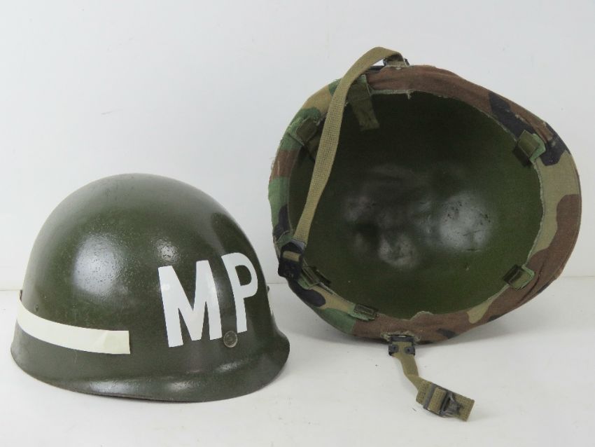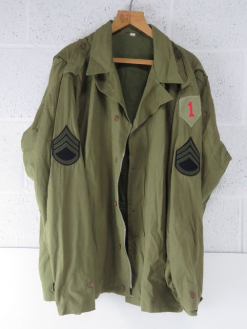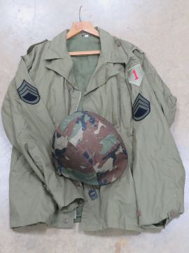 A USA Big Red 1 combat jacket, size 50R. Together with an M1 Combat helmet with liner, chin strap and helmet cover.