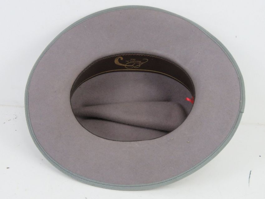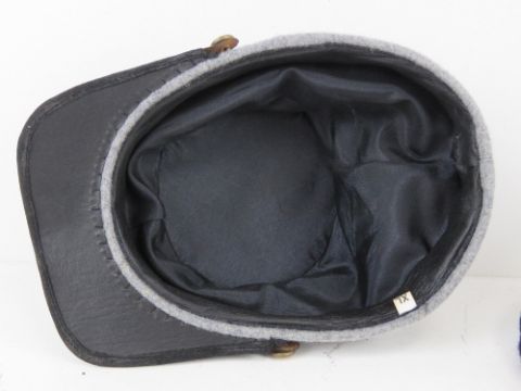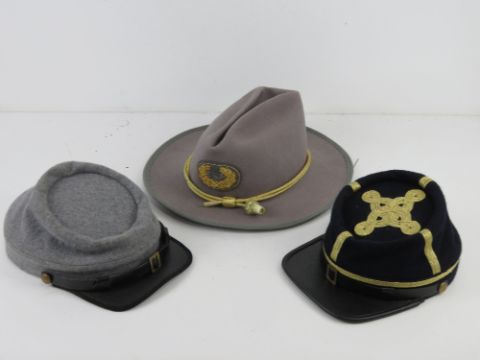 Three reenactor hats being; Confederate blue US Civil War Colonel cap size medium, Confederate US Civil War Kepi size XL and a Confederate US Civil War CSA Badged Slouch hat size 7 ½ .