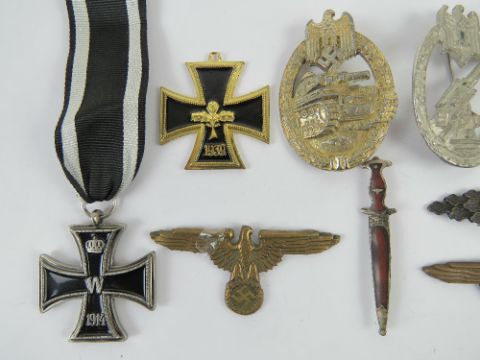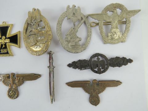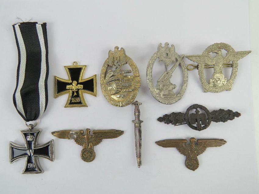 A quantity of assorted reproduction German badges and medals. Nine items.