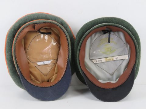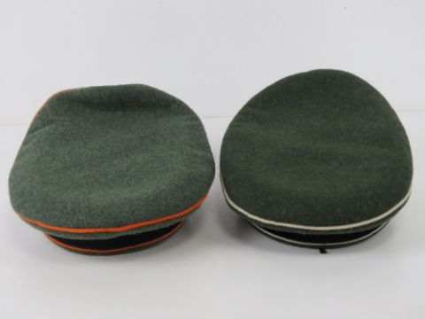 Two reproduction German peaked caps being SS Officer's cap (size 60) and Feldgendarmie Officer's cap (size 62).