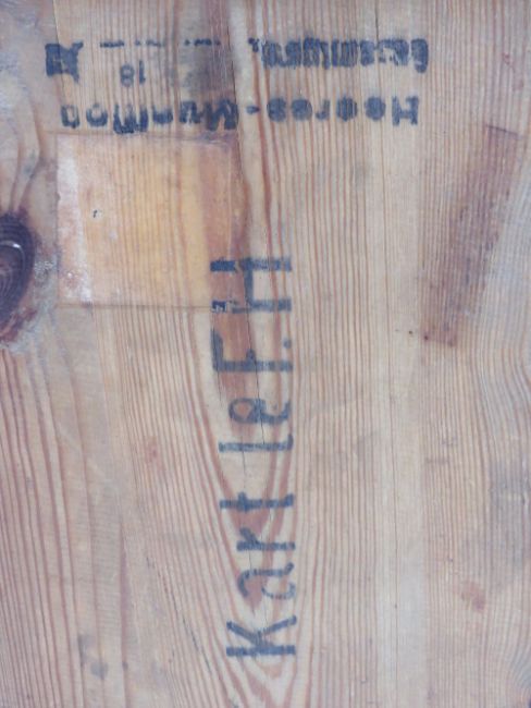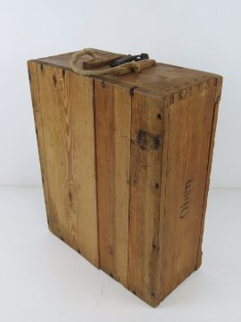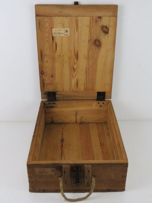A German LEFH wooden ammunition crate with handle and labels. Dated 1944.