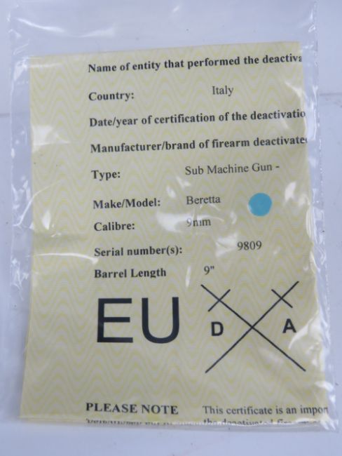 A deactivated WWII Beretta M38 SMG (SN 9809) and accessory Set.