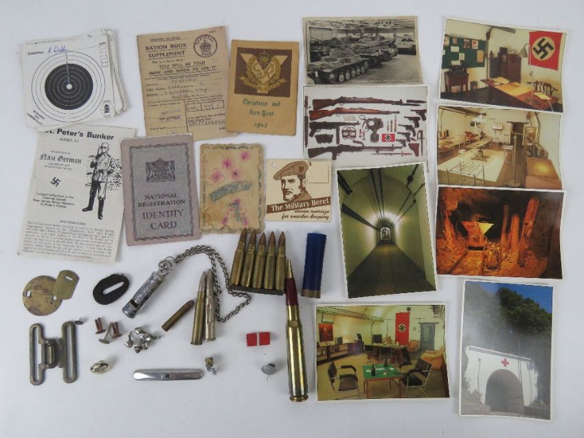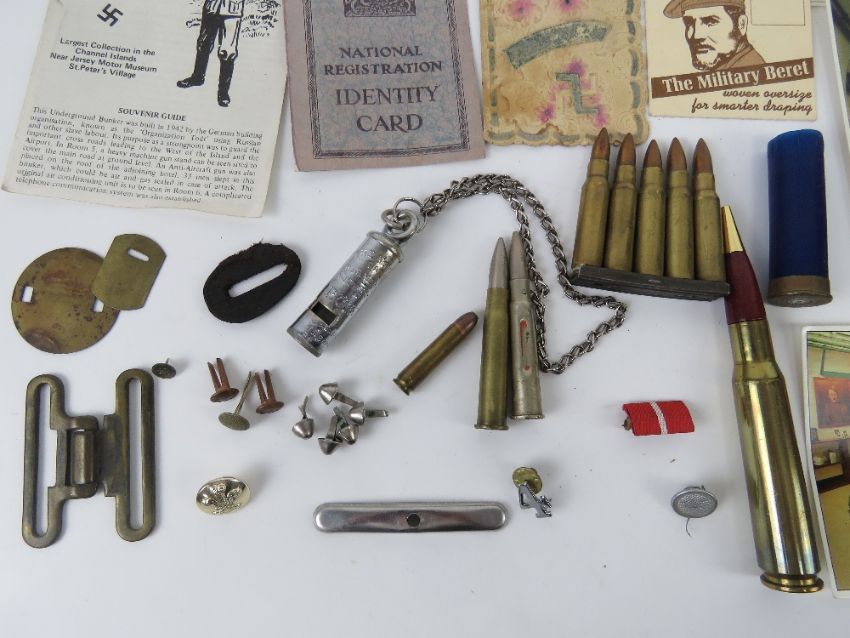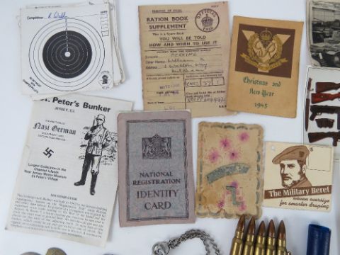 A quantity of assorted militaria inc; inert ammunition; identity card, 1945 Military Police Christmas card, ration book, contemporary postcards of military themes, Police whistle, etc.