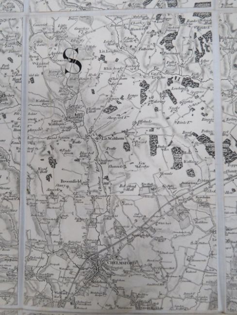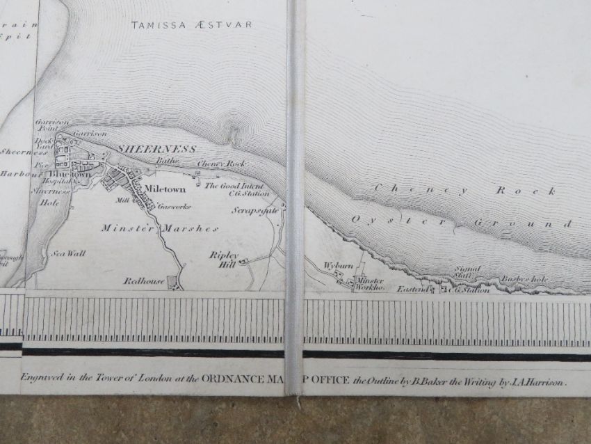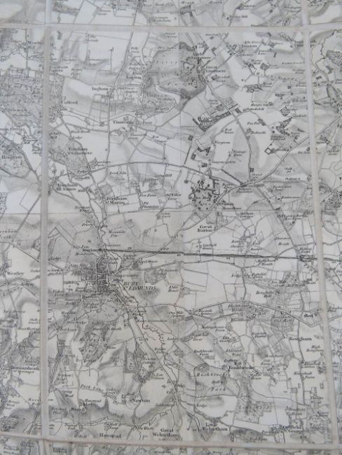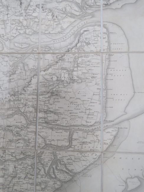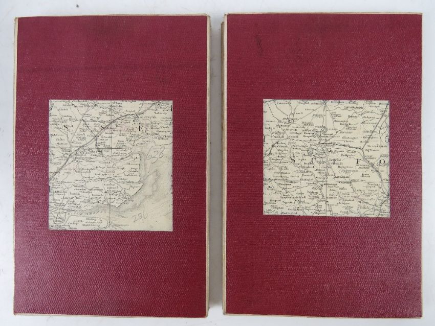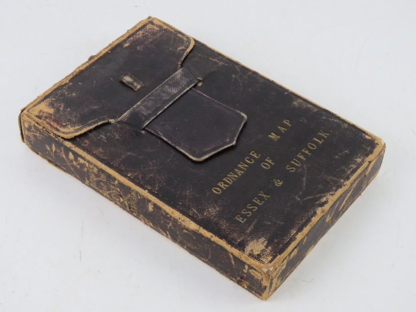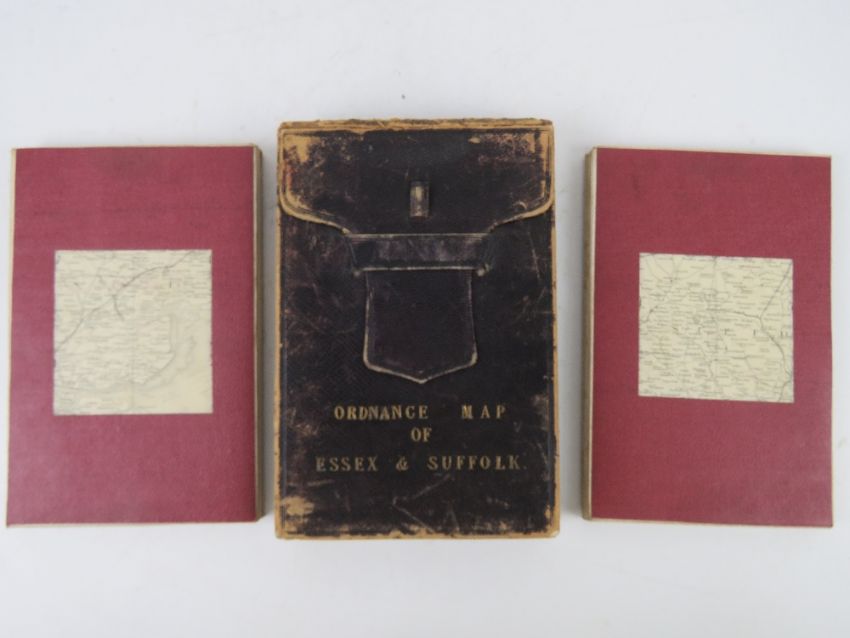 Ordinance map of Essex and Suffolk being two cloth bound fold-out maps in leather covered box, engraved at the Ordinance Map Office Southampton, the outline by J Adkins, the writing by J A Harrison, the hills by A Baker and published by Colonel Colby R.E,. F.R.S. L&E. M.R.I A&c Nov 9th 1843, each map in 35 sections and measuring approx 98.5 x 97cm.