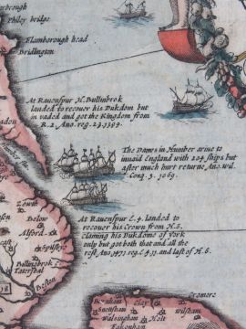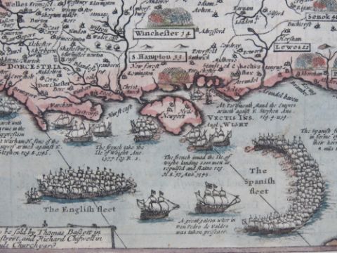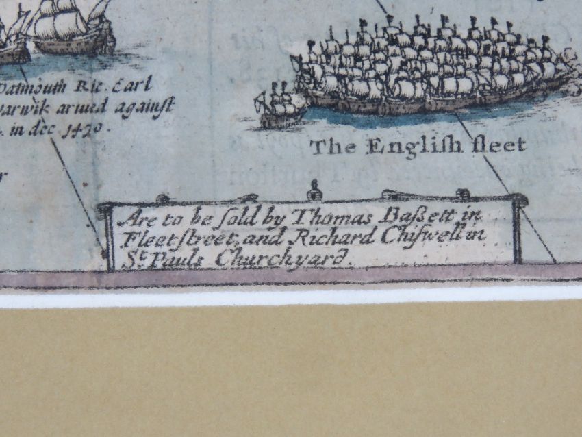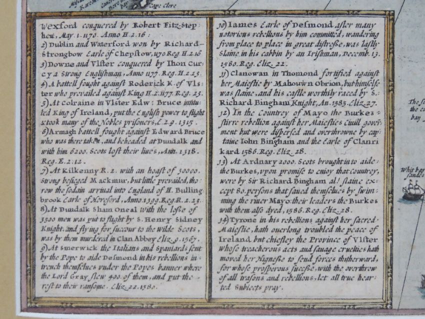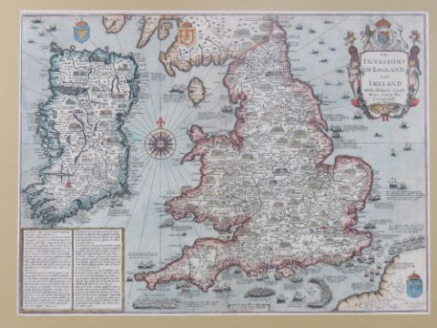 'The Invasions of England and Ireland with al their Civill Wars Since the Conquest by John Speed c1627', a hand coloured book section map having the Royal Coat of Arms of Great Britain to upper right. Sight size 52 x 38cm. Tape used in mounting (please see photos).