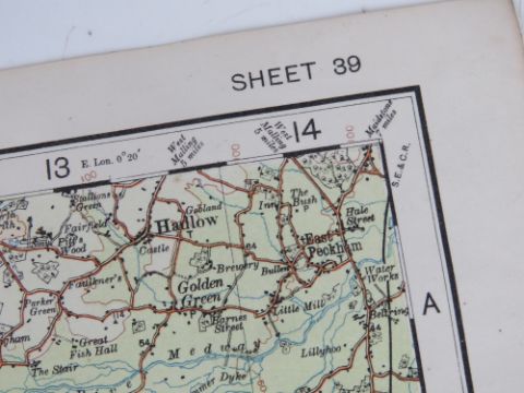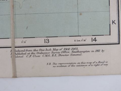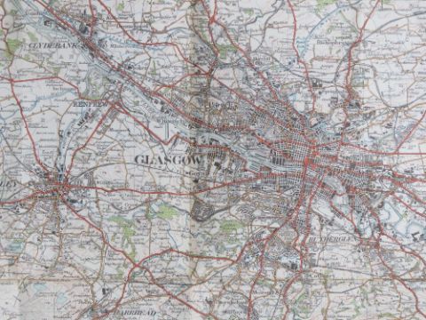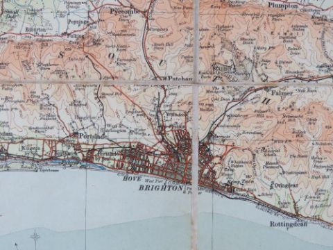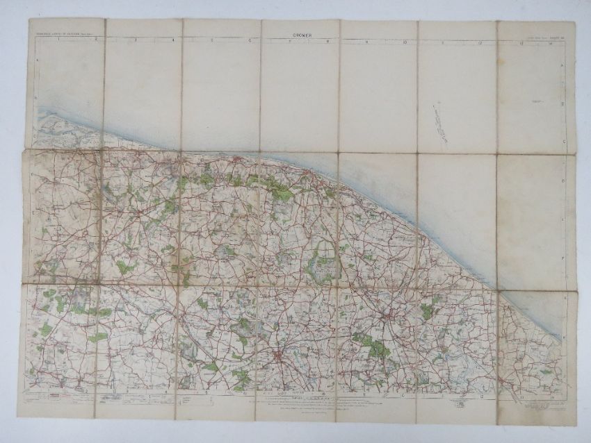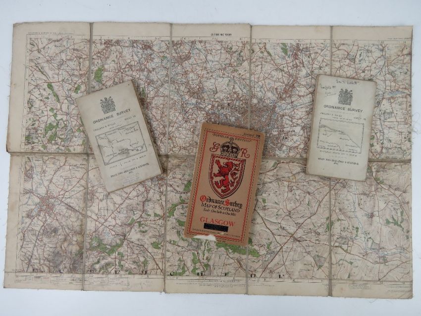 A quantity of assorted ordinance survey maps; three in twenty-one sections, being Cromer post 1912, Pwllheli post 1907, Brighton post 1911. Three maps each measuring approx 74 x 53.5cm. Together with Glasgow dated 1925 and measuring 99 x 72cm, and a part map of Birmingham. Five items.