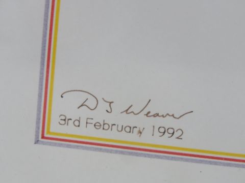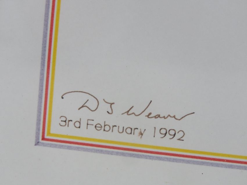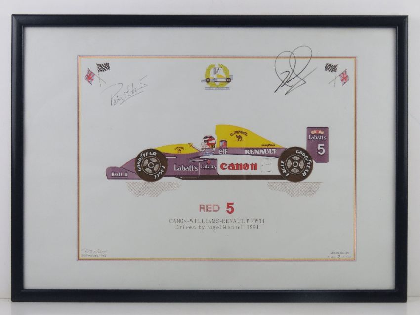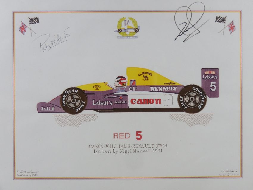 Signed Print; Red 5 Canon Williams Renault FW14, limited edition 2 of 4 signed upper left by Nigel Mansell, sight size 43 x 31, framed and glazed.