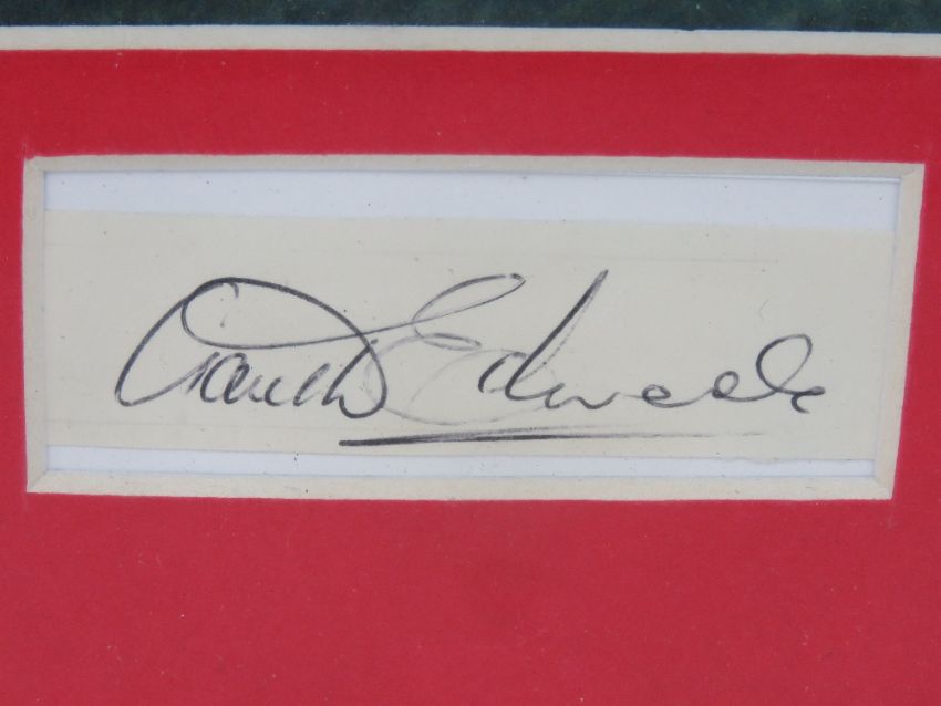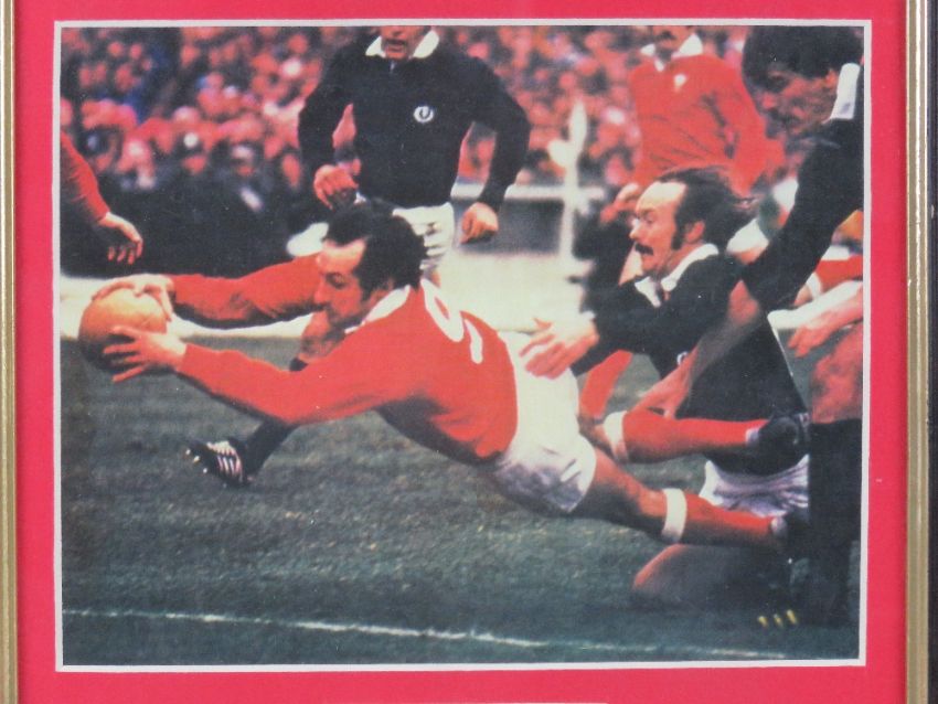 Gareth Edwards autograph, hand signed by Gareth Edwards, Welsh Rugby Union player, slip mounted on board below photographic print, framed and mounted, overall size 32 x 39.5cm.