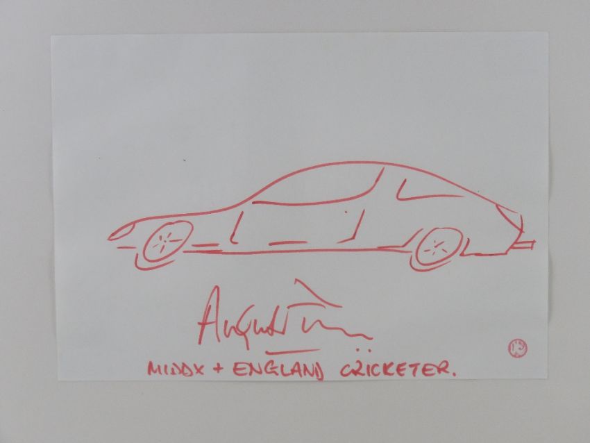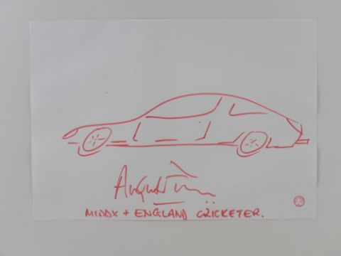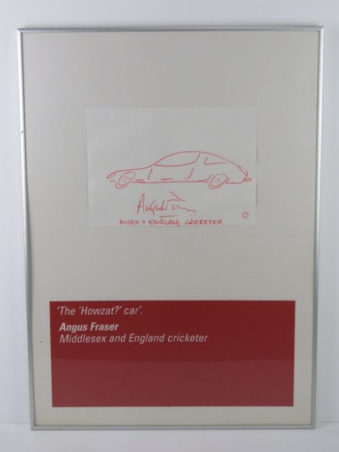 From the famous BEN (Motor and Allied Trades Benevolent Fund) auction at Brooklands Museum on February 17th 2001 where celebrities of the day were asked to create artwork depicting their dream cars. Angus Fraser (Lot 26 in the BEN auction) 'The Howzat? Car', 20 x 30cm. Signed by Angus Fraser, Middlesex and England Cricketer. Frames size 72 x 52cm. Prov: From the collection of a prominent member of the Guild of Motoring Writers.