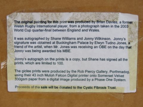 Signed print from 2003 Rugby World Cup quarter final between England and Wales, by Brian Davies, hand signed by Shane Williams with facsimile signature by Johnny Wilkinson with details verso, signed by the artist lower right, No 39/400, sight size 40.5 x 35cm, framed and glazed.
