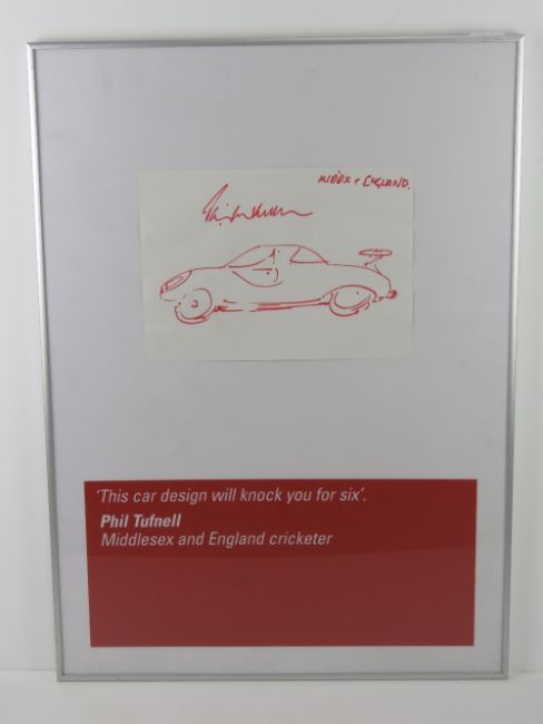 From the famous BEN (Motor and Allied Trades Benevolent Fund) auction at Brooklands Museum on February 17th 2001 where celebrities of the day were asked to create artwork depicting their dream cars. Phil Tuffnell (Lot 13 in the BEN auction) 'This car design will knock you for six', 20 x 30cm. Signed by Phil Tuffnell, Middlesex and England Cricketer. Frames size 72 x 52cm. Prov: From the collection of a prominent member of the Guild of Motoring Writers.