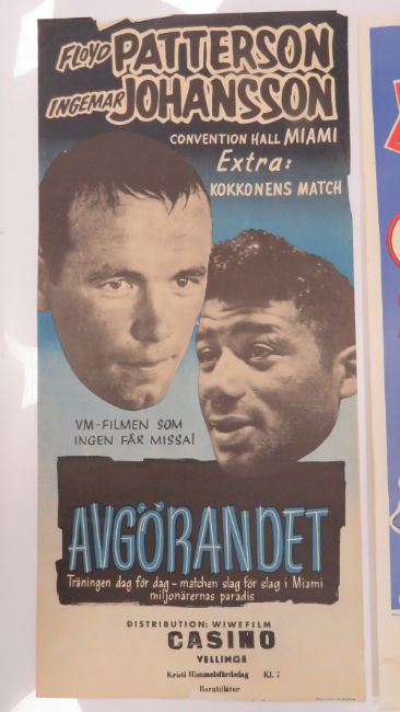 An original Floyd Patterson and Ingemar Johansson match poster in Swedish for the 1961 Convention Hall Miami match. Together with an original 91:an Karlsson slår knockout (1957) film poster featuring boxing world heavyweight (1959-1960) Ingemar Johansson. Two original posters, each measuring measuring 69.5 x 32.5cm.