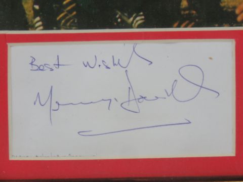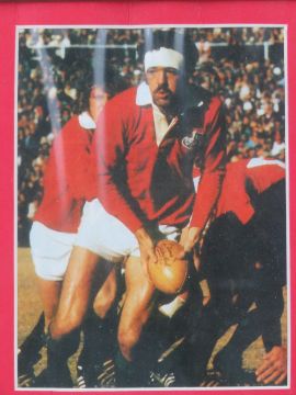 Thomas Mervyn Davies OBE autograph; hand signed slip Mervin Davies (9 December 1946 - 15 March 2012 often known as "Merv the Swerve", Welsh rugby union player who won 38 caps for Wales as a No. 8), mounted below photographic print, framed and glazed, overall 38 x 43.5cm.