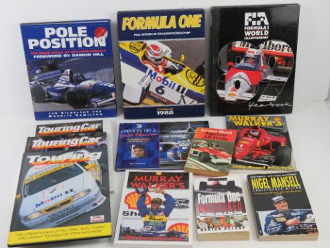 A quantity of assorted F1 and other racing car themed books including; 'Murray Walker Grand Prix Year' 1995 and 1996, James Hunt 'Against All Odds', etc.