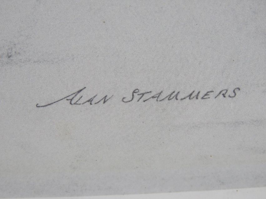 Print from a pencil sketch by Alan Stammers 'The Monaco Grand Prix' heading up to Casino Square from the start grid behind the port palace, 63 x 44cm. Framed. Prov: From the collection of a prominent member of the Guild of Motoring Writers.