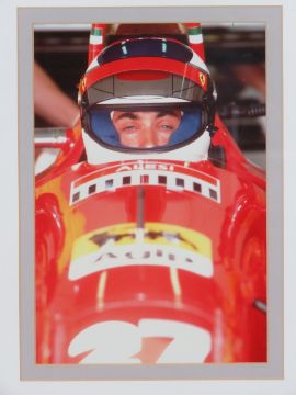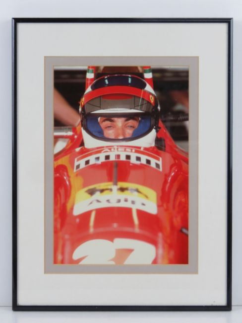 A photographic print of Jean Alesi Ferrari F1 Driver in his racing car, framed and mounted, sight size 19 x 27.5cm.