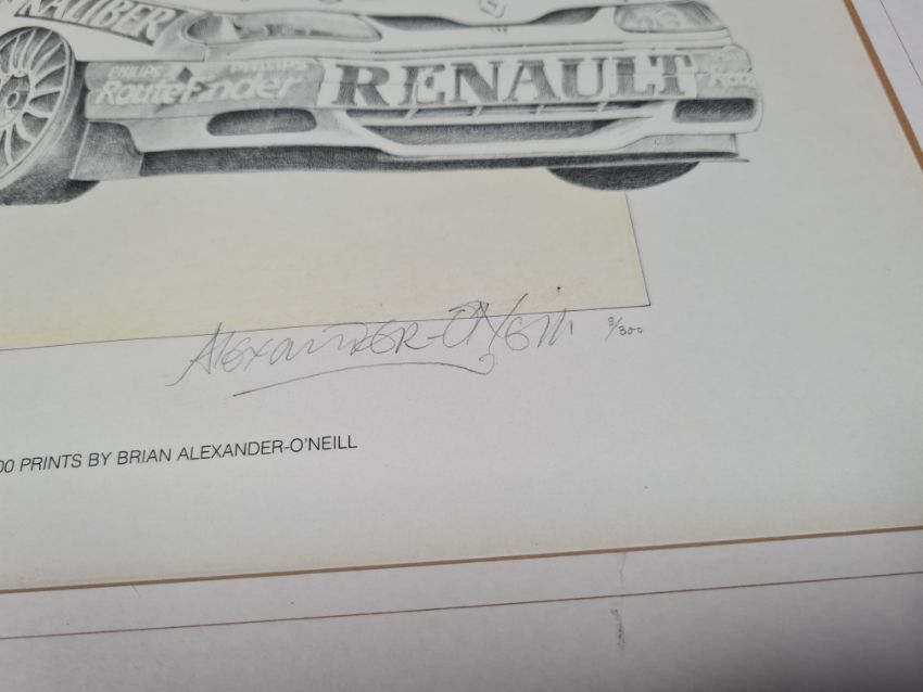 Signed limited edition print; 1996 BTCC Williams - Renault Laguna by Brian Alexander-O'Neill, signed in pencil lower right and numbered 8 of 300, mounted and framed (no glass), 36.5 x 26cm.
