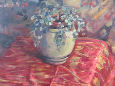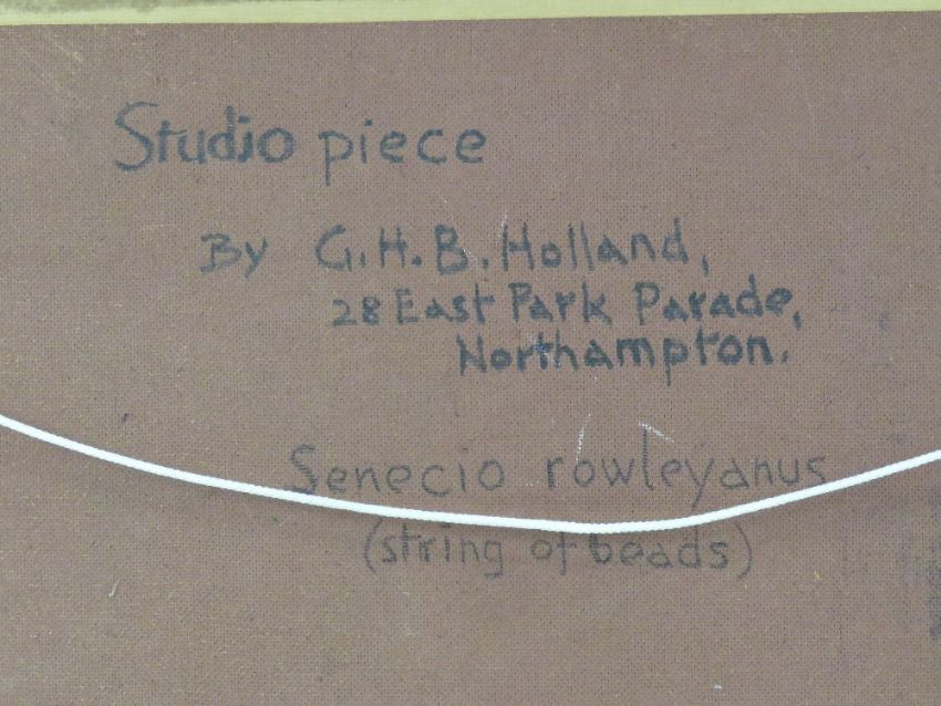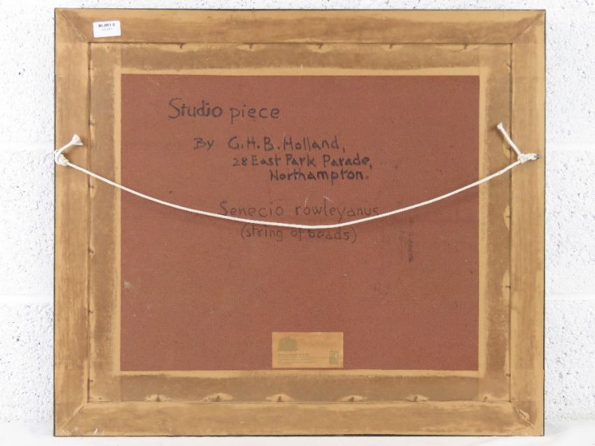 GHB (George) Holland (1901-1987), oil on board, a studio piece dated 1976 entitled 'Sewecio Rowleyanus - string of beads' depicting a potted plant in baluster vase upon a rich red table cloth sighed upper left, framed sight size 58 x 50cm.