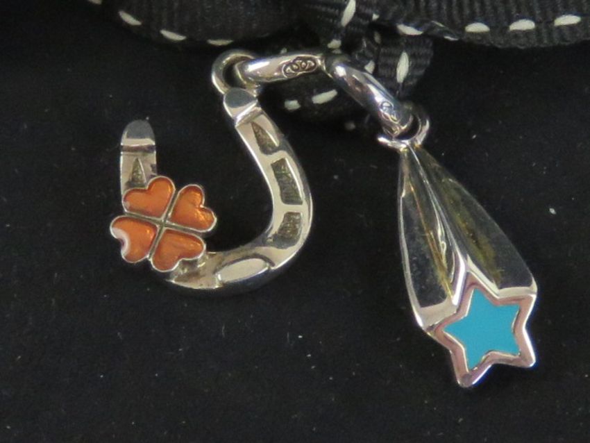 Links of London; two silver and enamel charms having Links hallmark upon in the form of a lucky horseshoe and a shooting star. In presentation box.