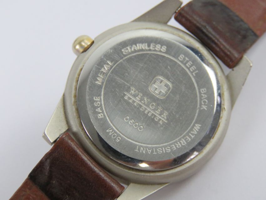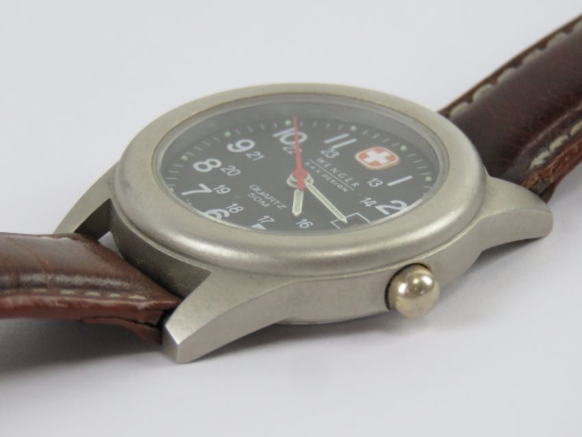 A Wenger Swiss Army SAK Men's Watch having black dial with date aperture, on leather strap.