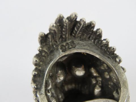 A white metal ring having skull in Native American style Chieftain feathered head dress, stamped 925, size U (slightly adjustable), 18.4g.