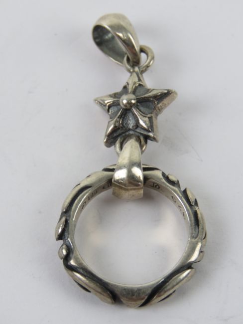 A silver pendant having star with rings suspended below, stamped 925 with maker's details and dated 1998, 5.5cm in length, 10.5g.