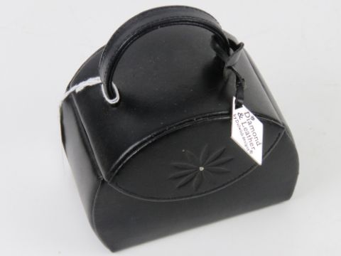 A contemporary black leather jewellery case having various compartments within. 12 x 8 x 13cm.