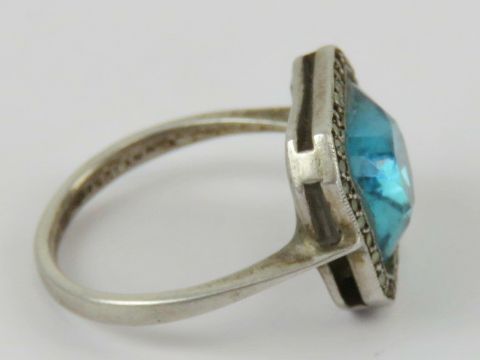 A silver, marcasite and blue stone cocktail ring, size K-L.