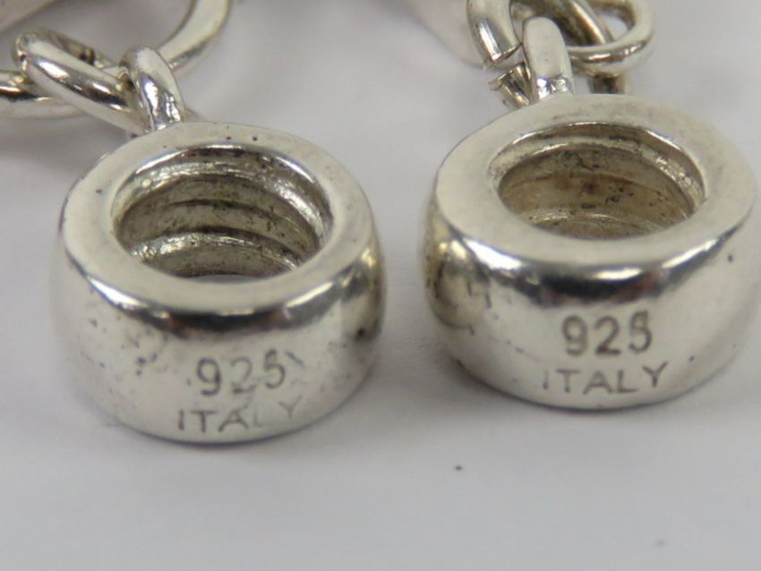 A set of four silver and enamel Pandora style charms, each stamped 925, in the form of a handbag, ballet slippers, flip flop and cowboy boot.