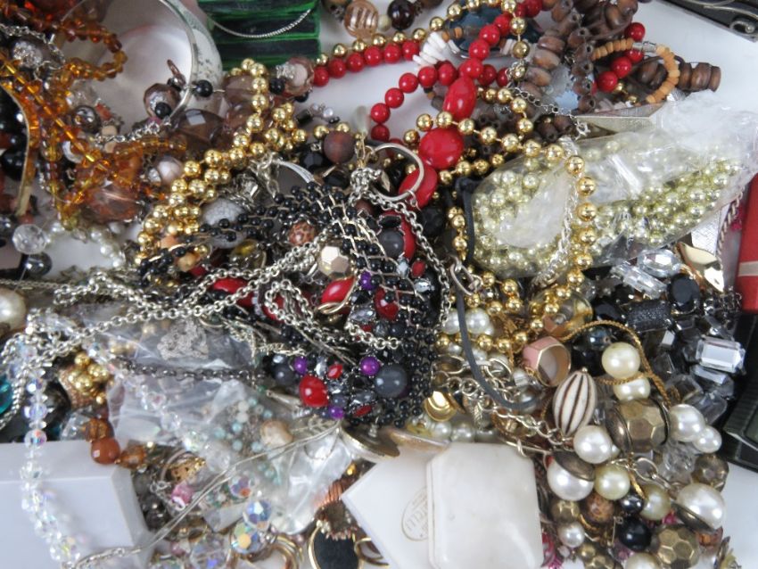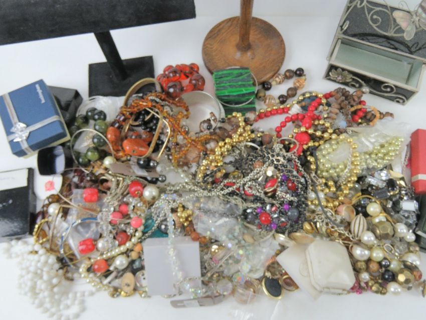 A quantity of assorted costume jewellery inc vintage turned wooden necklace display rack.