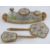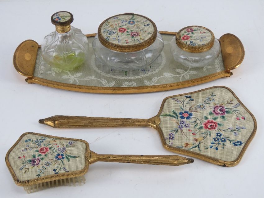 A mid-20thC dressing table set comprising perfume bottle, pots, tray, hairbrush and mirror.