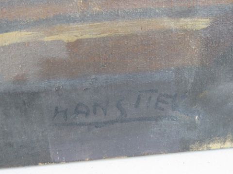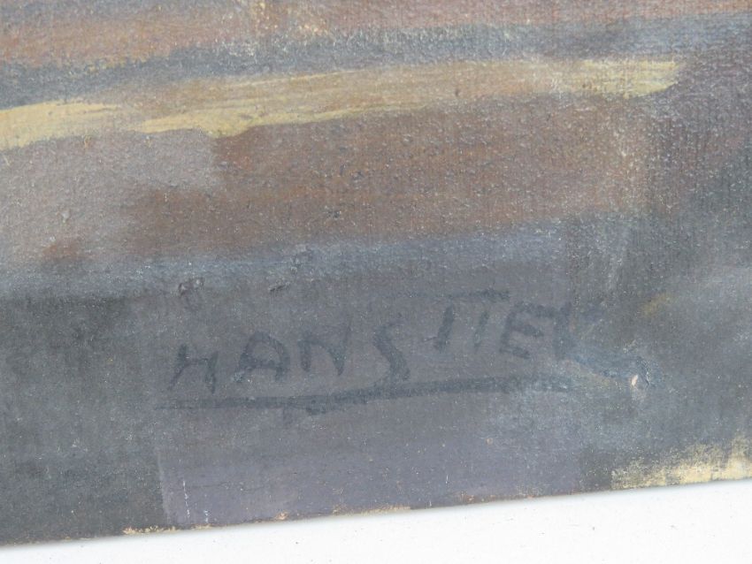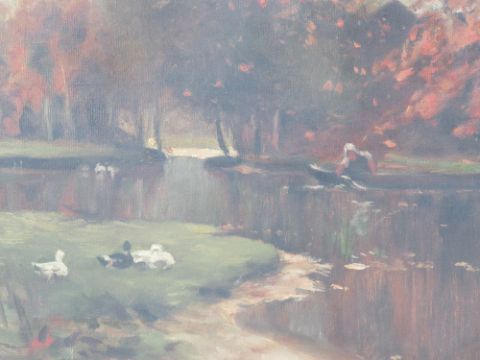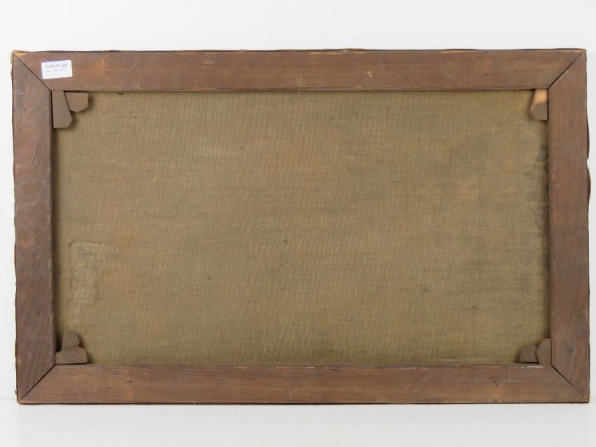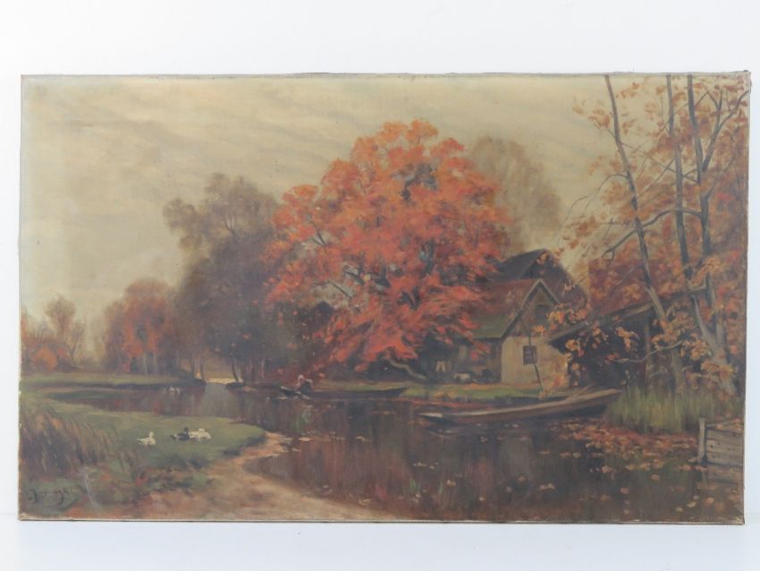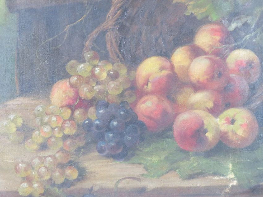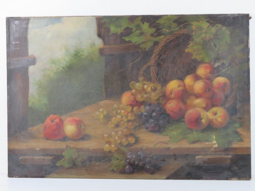Two oil on canvas paintings, one being farmhouse with pond before (73 x 45cm), the other being still life of fruit (81 x 54cm) each signed indistinctly,