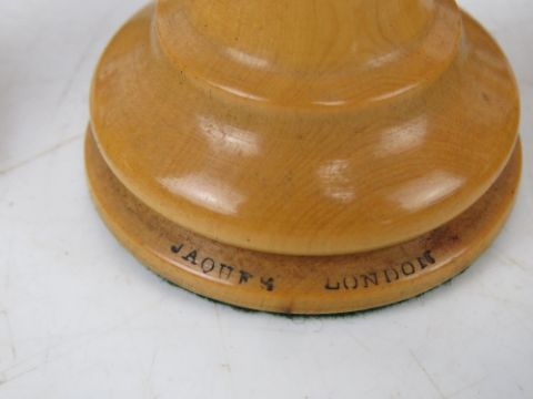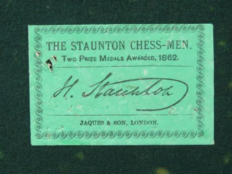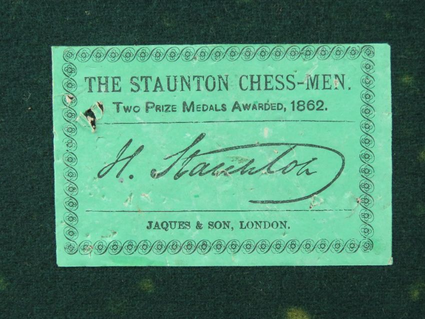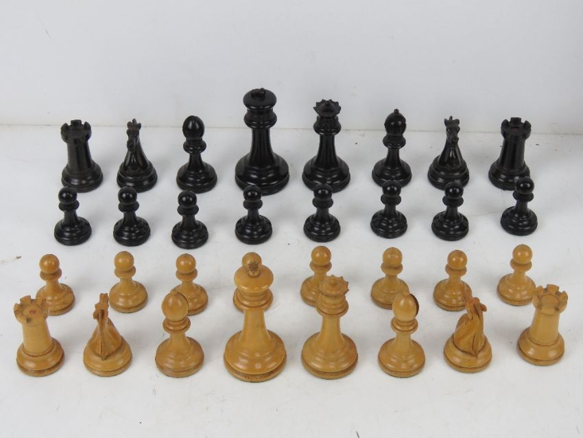 Jacques & Son Staunton 'Chess-Men' boxwood and ebony chess set, the kings stamped 'JAQUES LONDON' and one rock and knight from each side having crown mark upon, the rooks and knights also stamped with a crown mark, the kings approx 10cm high (one a/f part present), the pawns approx 4.7cm high, in mahogany case with key, felt lined interior, paper label to lid inscribed "The Staunton Chess-men Two Prize Medals Awarded, 1862" with facsimile signature.