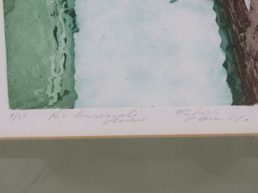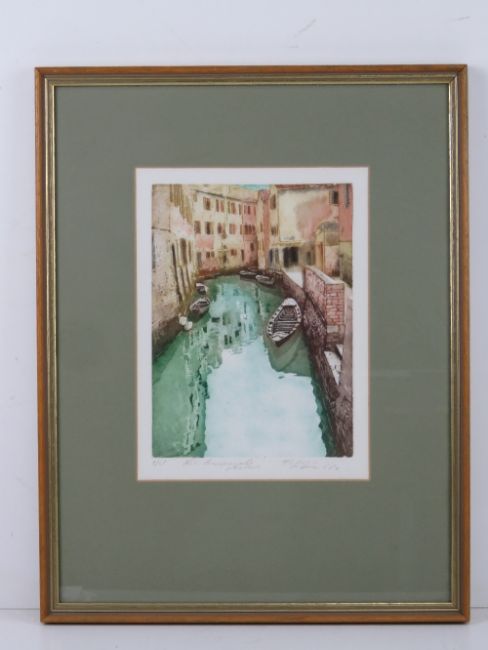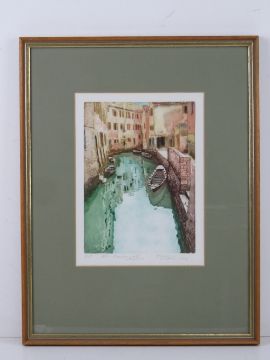 Signed limited edition print being a canal in Venice, number in pencil 9/45 and named below, sight size 23.5 x 17cm, framed and mounted.