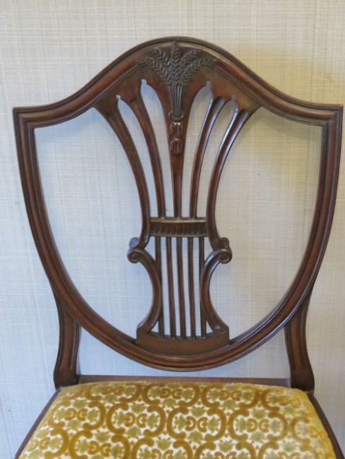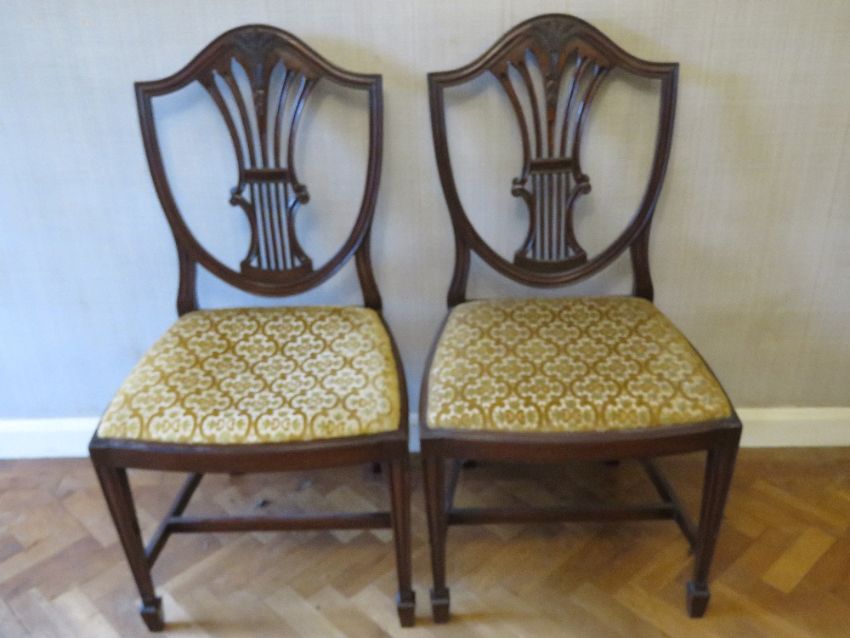 A good pair of Hepplewhite style shield back mahogany dining chairs, each with drop in seat.