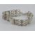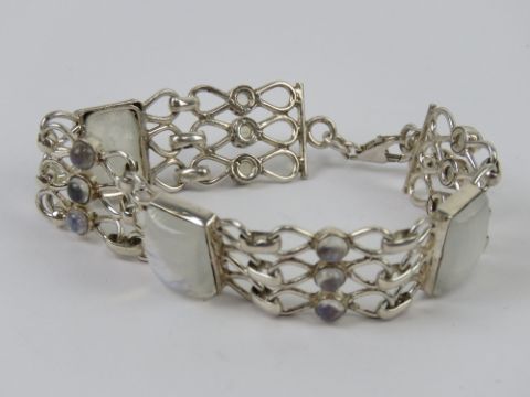 A silver and moonstone bracelet, three rectangular cut moonstone cabacons with rows of small round cut cabachons between, approx 1.6cm wide, 18-20cm in length. In presentation box.