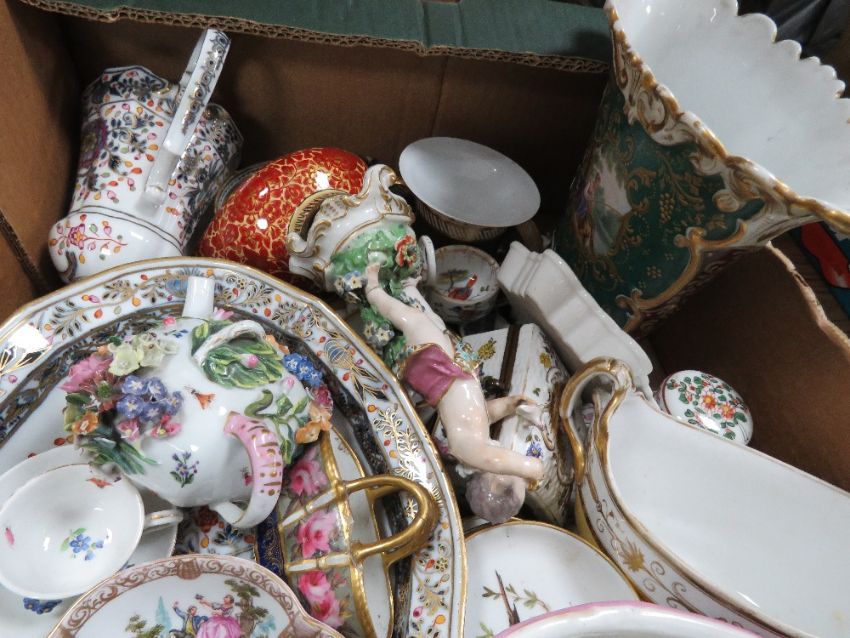 A quantity of late Victorian and early 20thC ceramics inc Oriental cup and saucer, French cup and saucer, Oriental fine porcelain finger bowl, various pieces with crossed swords maker's mark upon, possibly Meissen, a set of handmade German bird-themed pin trays, an early Spode cup and saucer etc, a/f.