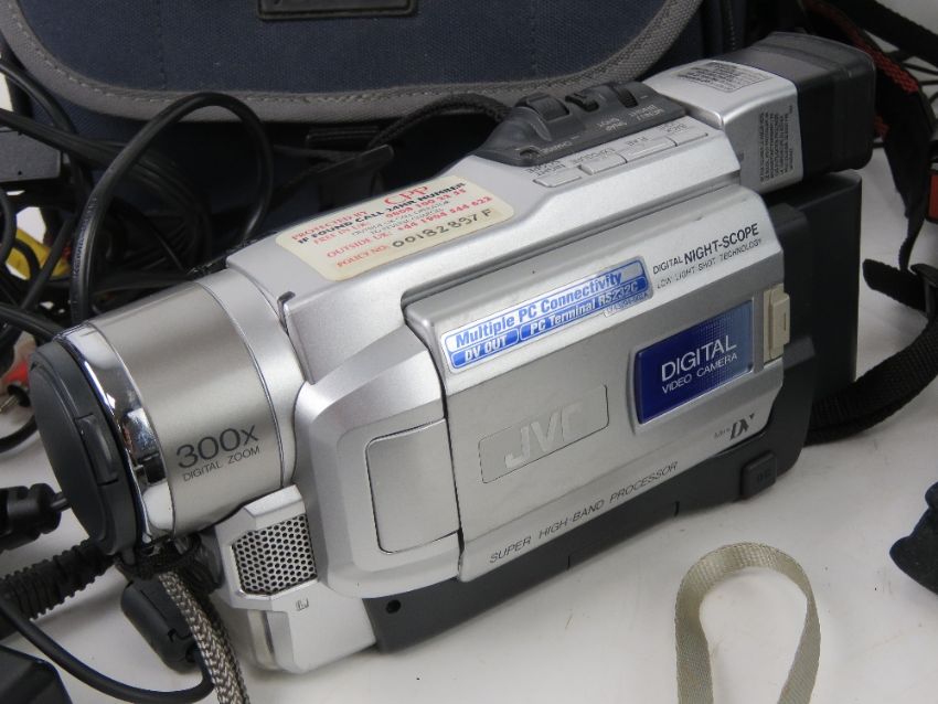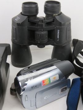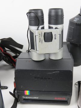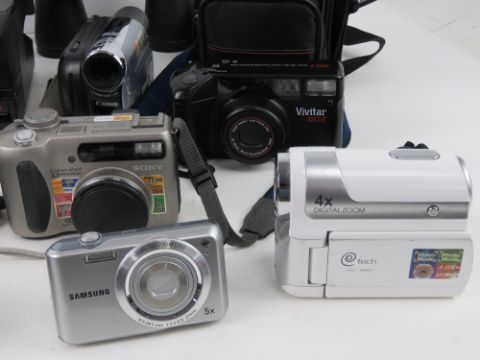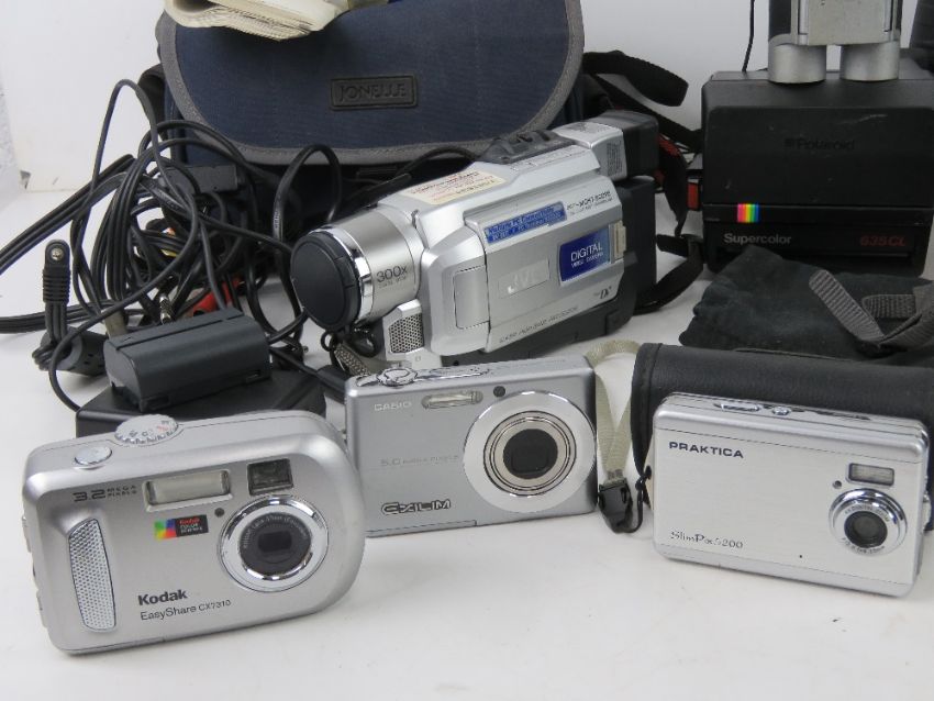 A quantity of cameras and binoculars inc a Poleroid Super Colour 635 CL, a Cannon Camcorder, Sony Cyber-Shot, JVC Camcorder, etc.