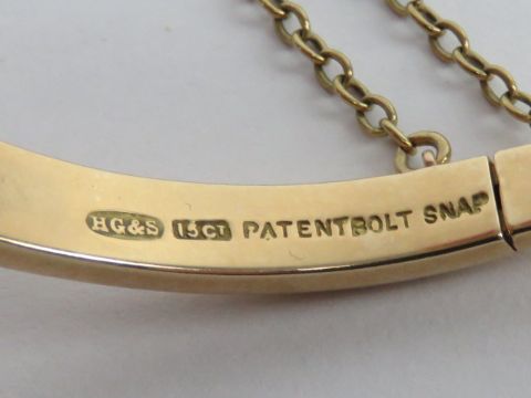 A 15ct gold hinged bangle having 'patent bolt snap', stone having been replaced with plastic bead, 14.7g.
