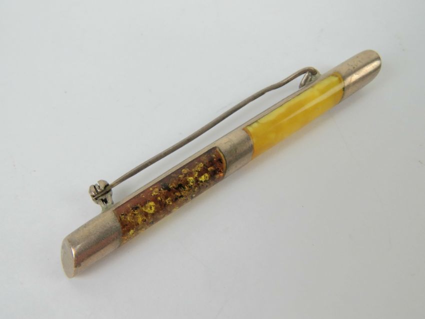 A white metal bar brooch having inset Baltic and egg yolk amber, no apparent hallmarks, approx 7cm in length.