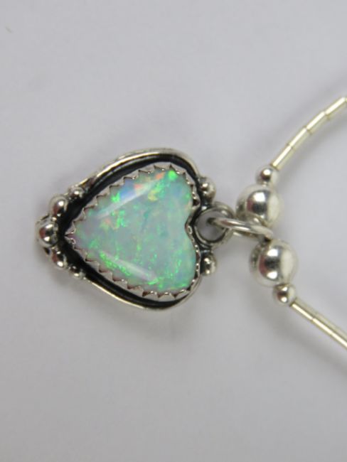 A 925 silver and opal pendant in the form of a heart on a Native American style beaded chain.