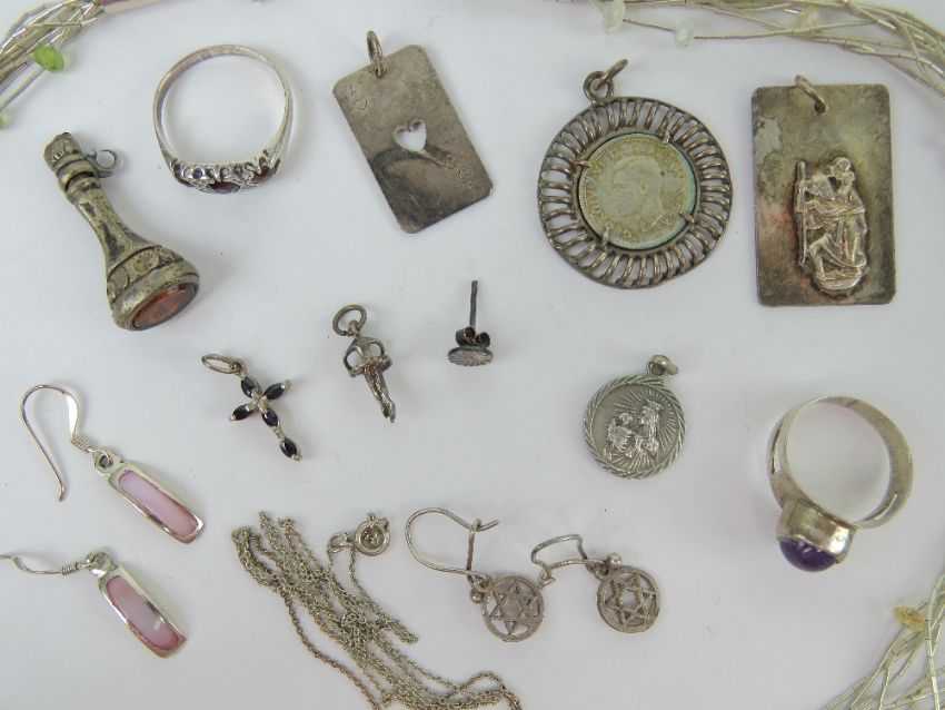 A quantity of assorted silver and white metal jewellery including; rings, coin pendant, Sterling silver Navajo style bead chain necklace, etc. Total weight 49.6g.