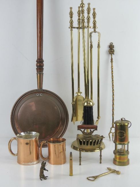 A quantity of assorted copper and brass inc toasting fork, copper plated tankards, copper warming pan, brass coloured companion set etc.