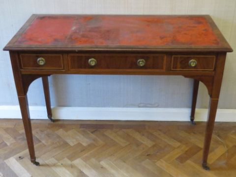 A good late 19th early 20th century escritoire writing desk, one long drawer with short opposing, raised over square tapering legs terminating in brass castors, 106 x 53 x 76cm.