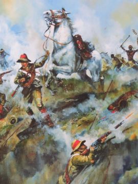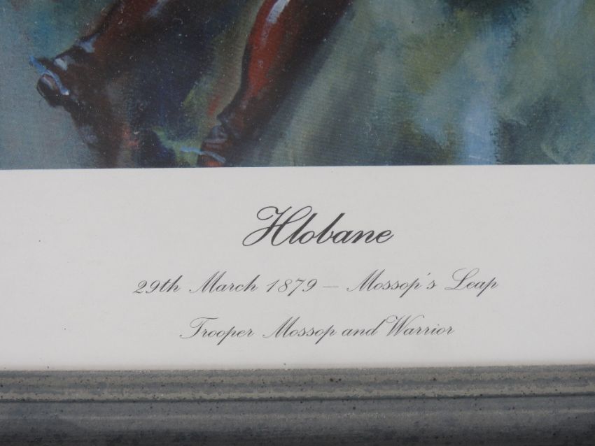 Jason Askew; two military prints being Mossop's Leap and the defence of Rorke's Drift, each framed and mounted, overall 68 x 49cm and 90 x 65cm.
