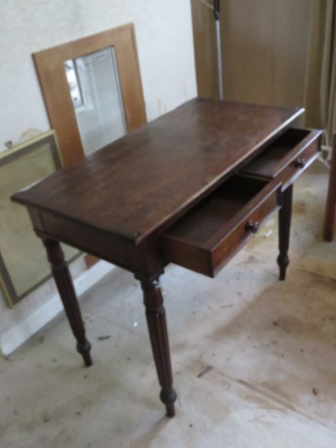 A 19th century twin drawer side table raised over reeded legs, 94 x 47 x 75cm.