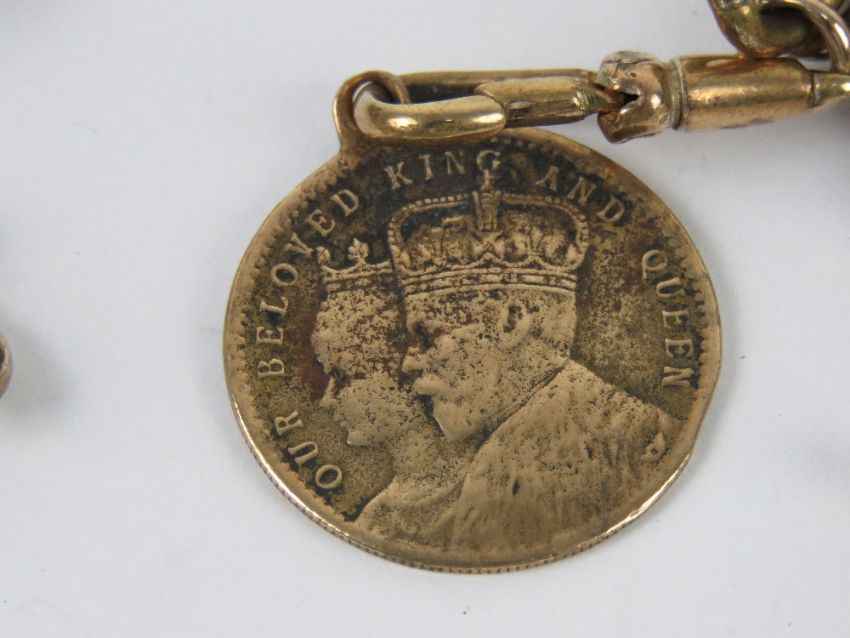 A quantity of assorted watch chains and accessories inc HM silver cheroot holder a/f, a yellow and rose metal seal fob opening to reveal compartment within, T-bars, etc.