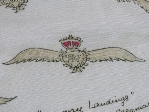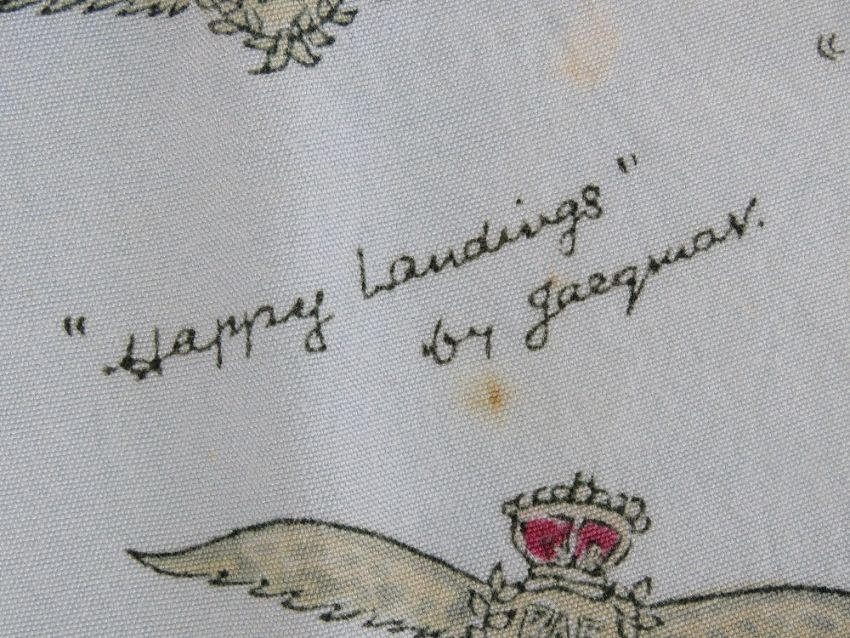 A rare WWII themed Jacqmar scarf 'Happy Landings' with Winston Churchill quotes and RAF wings upon, measuring approx 90 x 78cm.