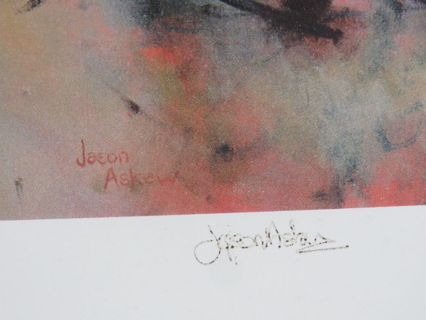 Jason Askew; Signed print, 'Saving the guns', framed and measuring 67.5 x 49.5cm.