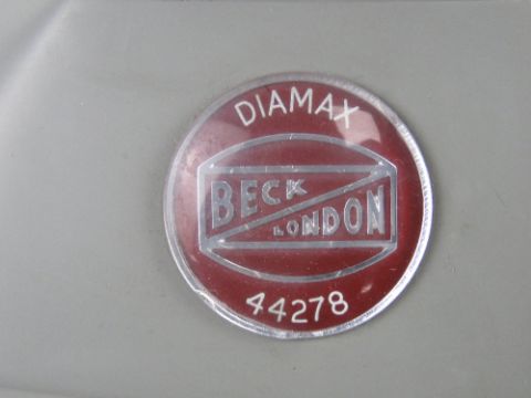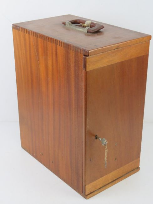 A Beck London Diamax 44278 microscope in wooden carry case having drawer pulling out to reveal three additional lenses.